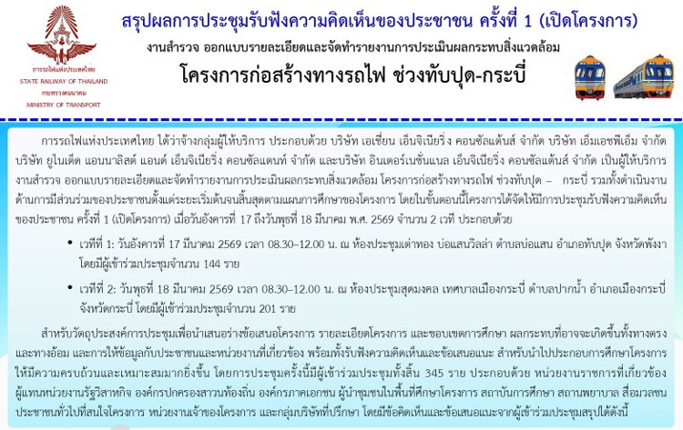 สรุปผลการประชุมรับฟังความคิดเห็นของประชาชนครั้งที่ 1 (เปิดโครงการ) งานสำรวจ ออกแบบรายละเอียดและจัดทำรายงานการประเมินผลกระทำสิ่งแวดล้อม โครงการก่อสร้างทางรถไฟ ช่วงทับปุด-กระบี่ สรุปผลการประชุมรับฟังความคิดเห็นของประชาชนครั้งที่ 1 (เปิดโครงการ งานสำรวจ ออกแบบรายละเอียดและจัดทำรายงานการประเมินผลกระทำสิ่งแวดล้อม โครงการก่อสร้างทางรถไฟ ช่วงทับปุด-กระบี่ เวทีที่ 1 วันอังคารที่ 17 มีนาคม 2569 […]